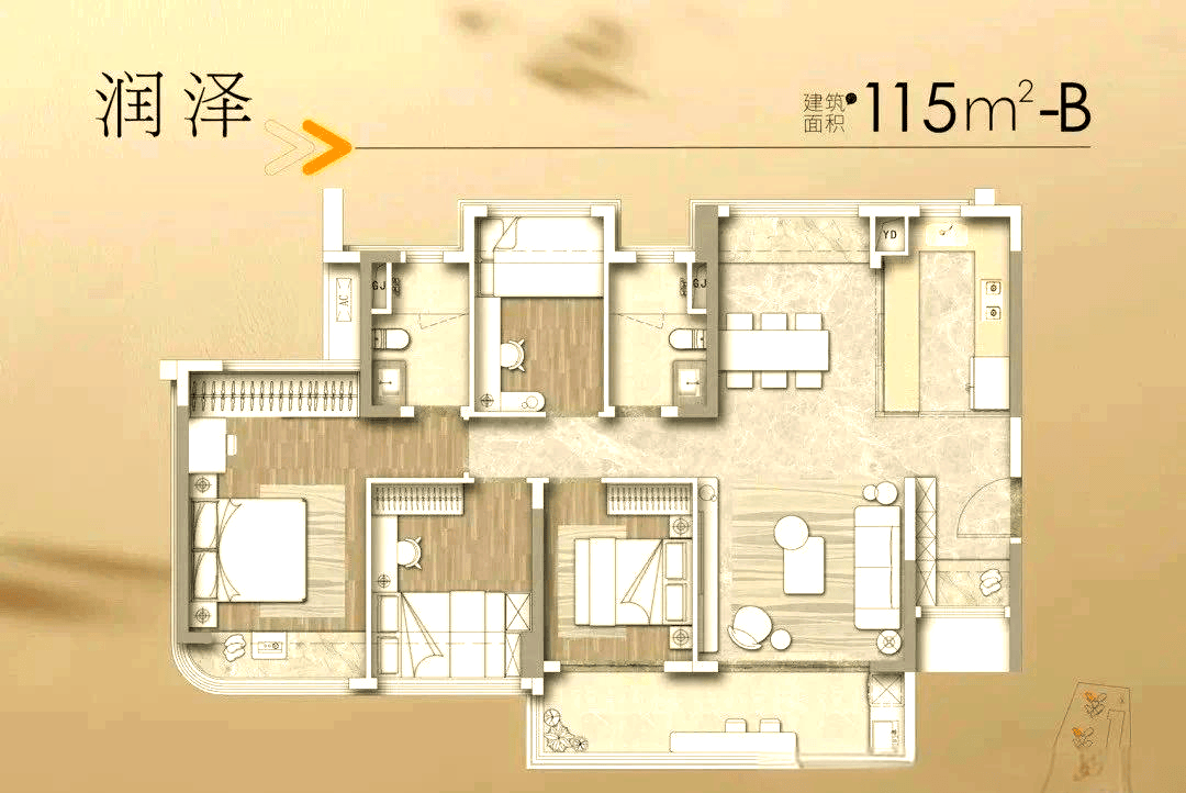 如果您追求更高的居住品质,那么一百一十五平方米的四房两厅两卫户型将是您的不二之选。这个户型主打改善体验,采用了五开间朝南且南北对流的设计,最大限度地引入了自然光和新鲜空气。站在阳台上,您可以俯瞰社区的美景,感受微风拂面的惬意。LDKG一体化设计是该户型的一大亮点。它将客厅、餐厅、厨房以及阳台打通,打造出一个超过六十平方米的家庭核心区。这个巨大的公共空间,不仅是家庭聚会的场所,也是孩子玩耍的乐园,更是展示家庭品味的舞台。在这里,您可以举办家庭派对,邀请亲朋好友共度美好时光;也可以陪孩子做游戏,享受天伦之乐。